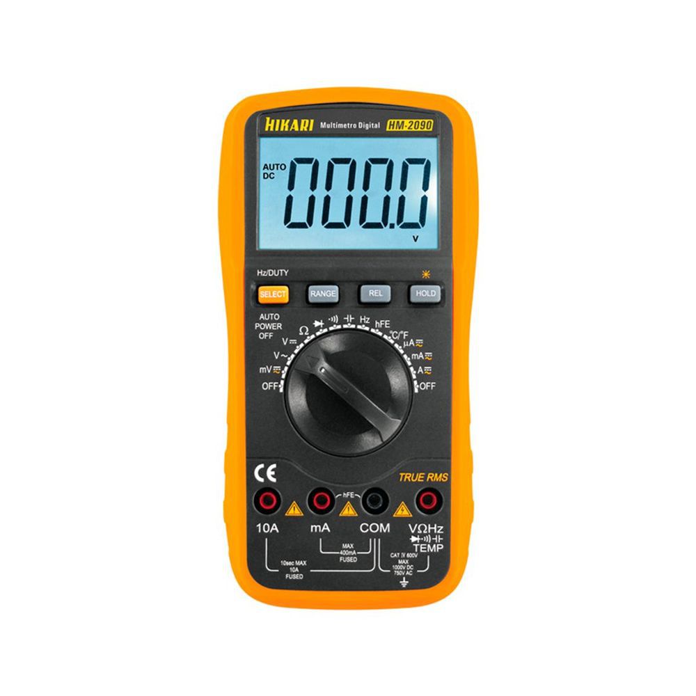O Multímetro Digital modelo HM-2090 se destaca pelas medidas de Tensão DC/AC, Corrente DC/AC, Resistência, Capacitância, Frequência, Duty Cycle, Temperatura e pelos testes de Transistor hFE, Diodo e Continuidade. Como característica adicional apresenta as funções: Medidas AC True RMS, Auto Power Off, Data Hold, Relativo, Iluminação do Display e Indicador de Bateria Fraca. O Multímetro Digital HM-2090 pode ser utilizado para medições em circuitos eletrônicos, circuitos de ramificação, linhas de baixa tensão e na indústria.