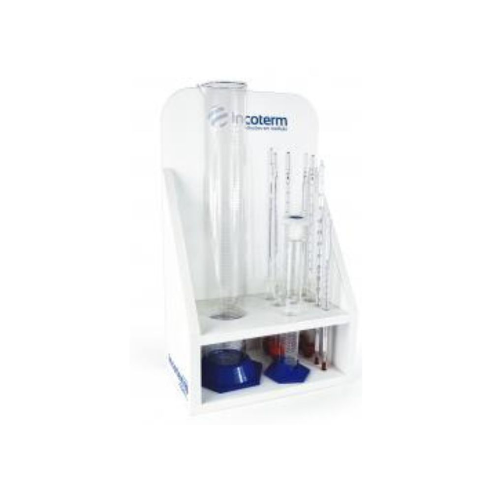 Suporte de balcão, desenvolvido em MDF, com cavidades para proveta de 100 ml e 1.000 ml, seis densímetros e 2 termômetros.